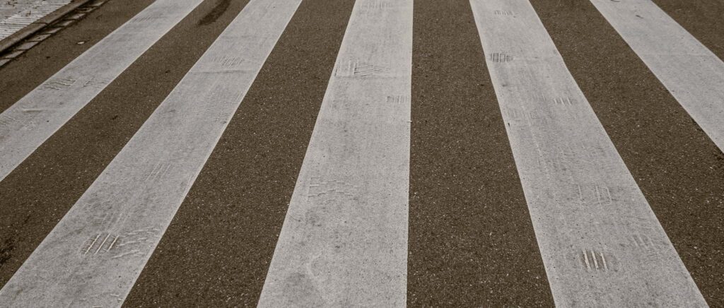 Ein auf die Straße aufgebrachter Zebrastreifen. Und wenn man genau hinsieht, sieht man auf dem Zebrastreifen kleinere Streifen, die durch Reifen in den Zebrastreifen gedrückt wurden.
