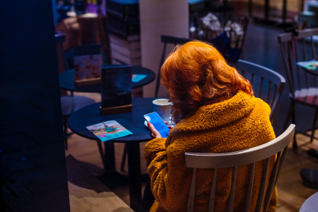 Schreibt oder liest die Dame eine wichtige Nachricht?