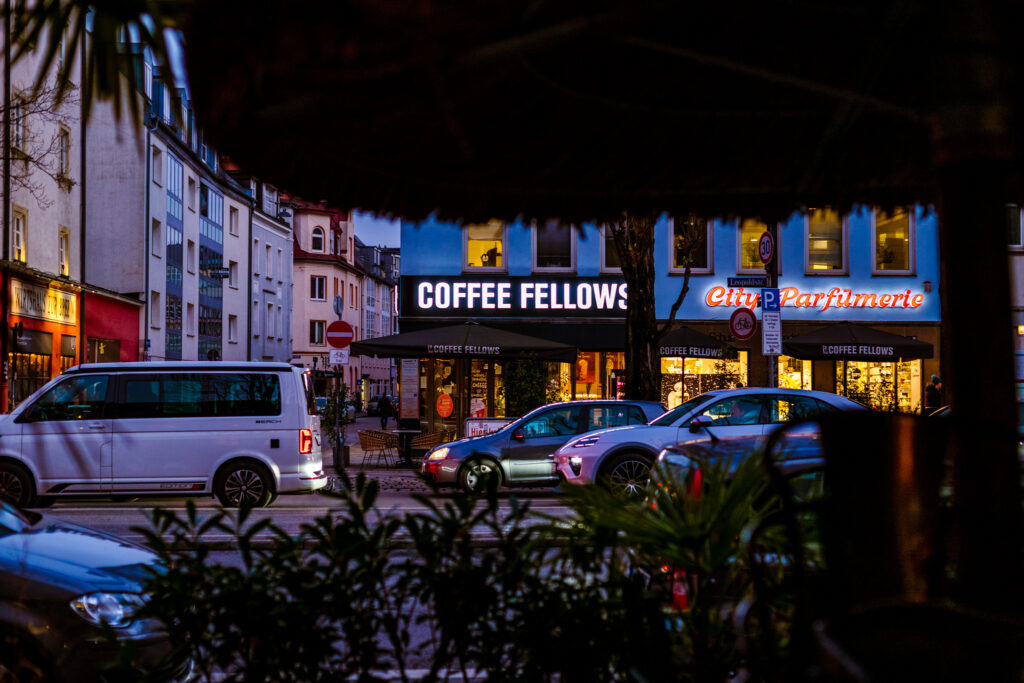 Am Nachmittag, nämlich genau dann, wenn die Sonne so langsam untergeht, lassen sich in den Schaufenstern tolle Spiegelungen aufnehmen, während die gespiegelte Umgebung noch nicht total im Dunkeln verschwindet.